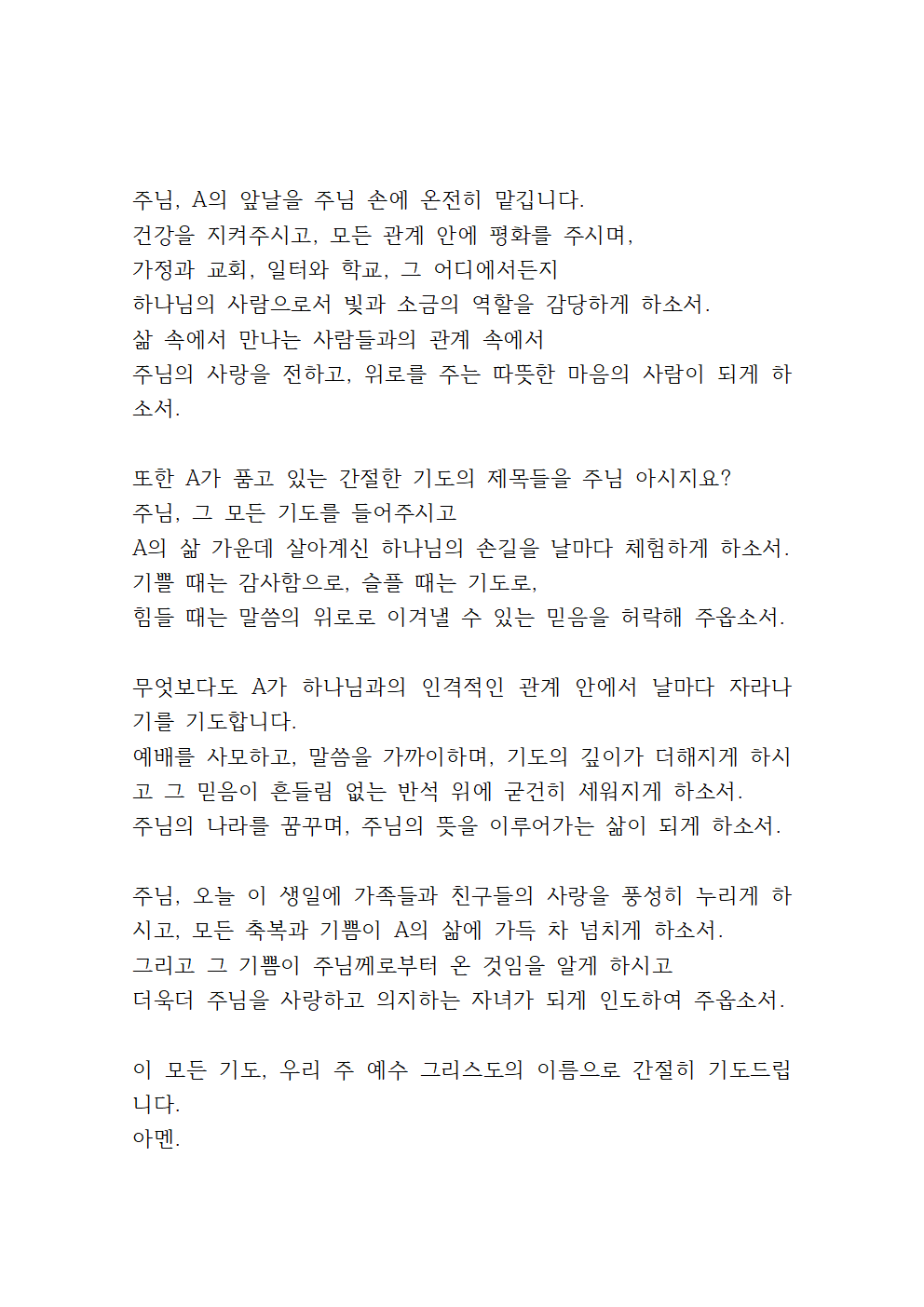주님, 오늘 이 생일에 가족들과 친구들의 사랑을 풍성히 누리게 하시고, 모든 축복과 기쁨이 A의 삶에 가득 차 넘치게 하소서.