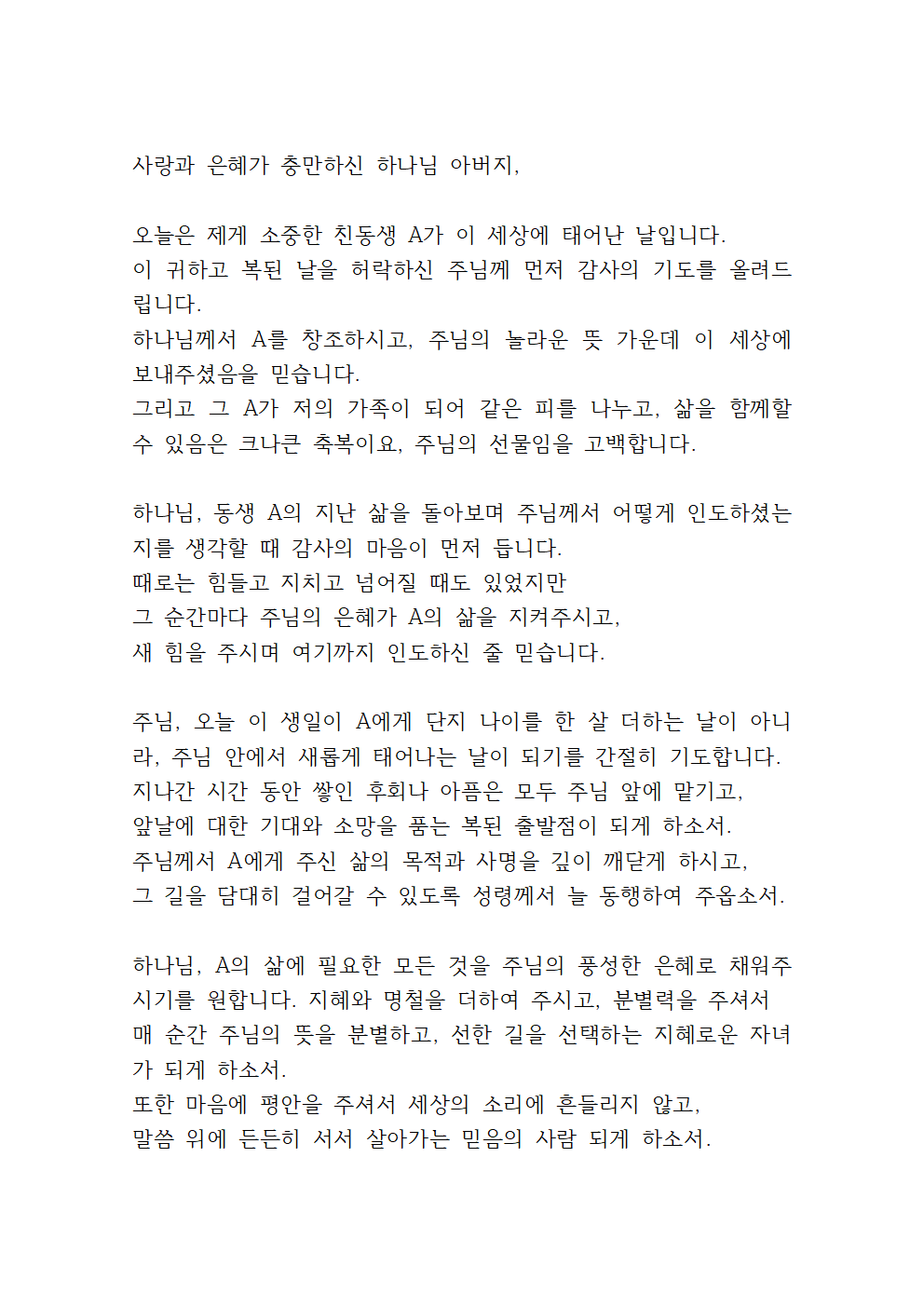 사랑하는 친동생 A의 생일을 맞아 동생을 위한 진심이 담긴 축복과 하나님의 인도하심을 구하는 기도문이면 좋을 것 같아요.