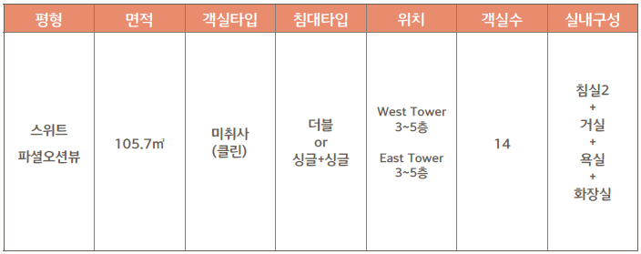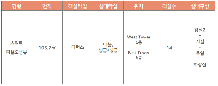 ○ 스위트 파셜오션뷰 (클린) : 총 14실 / 정원 5인 (최대 8인)