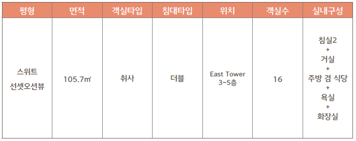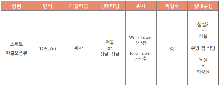 ○ 스위트 파셜오션뷰 (취사) : 총 32실 / 정원 5인 (최대 8인)