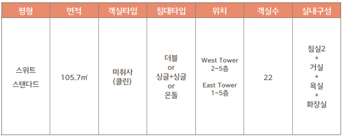 ○ 스위트 스탠다드 (클린) : 총 22실 / 정원 5인 (최대 8인)
