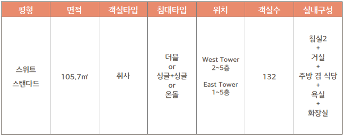 ○ 스위트 스탠다드 (취사) : 총 132실 / 정원 5인 (최대 8인)