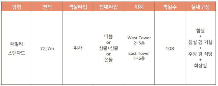○ 패밀리 스탠다드 (취사) : 총 108실 / 정원 4인 (최대 6인)