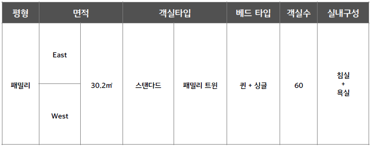 ○ 패밀리 스탠다드 : 총 60실 / 정원 2인 (최대 3인)