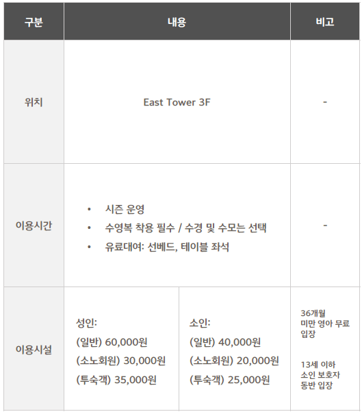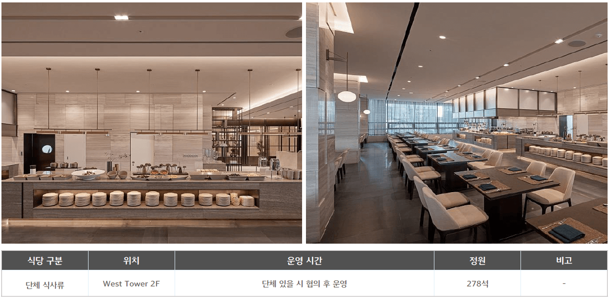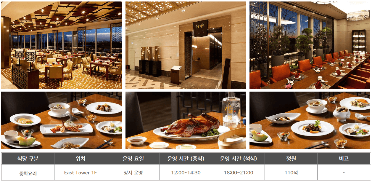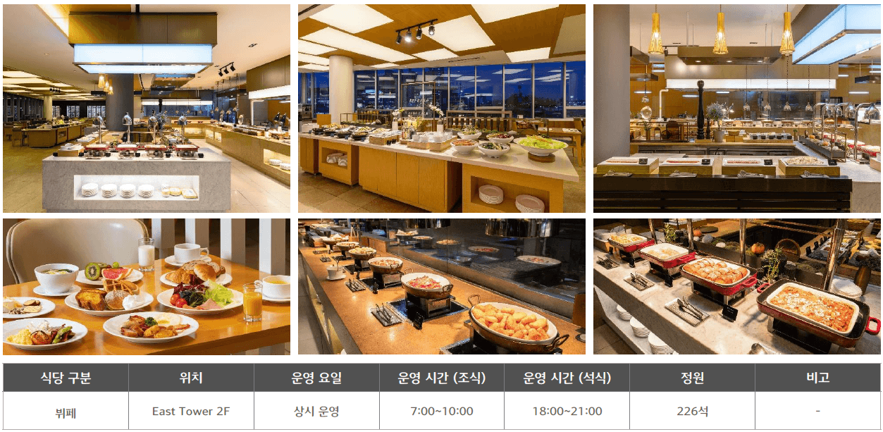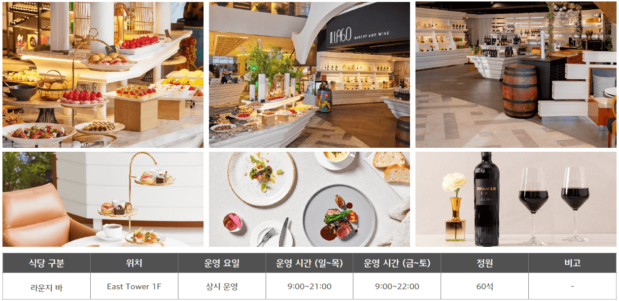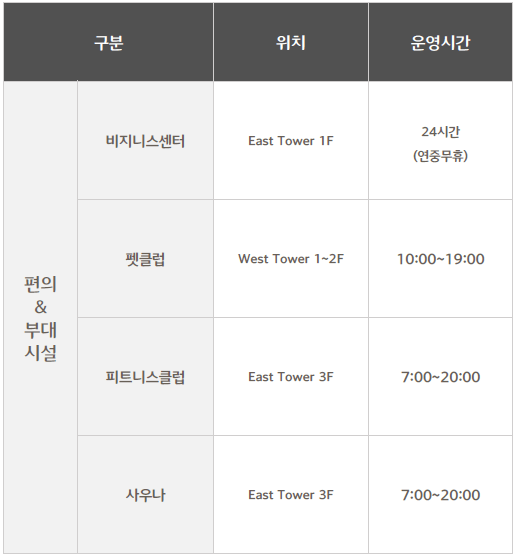 ○ 부대시설 : 식음업장(셰프스 키친, 죽림, 일라고, 델리, 비스타) / 야외 수영장 / 피트니스 클럽 / 사우나 / 비즈니스 센터 / 펫샵 등