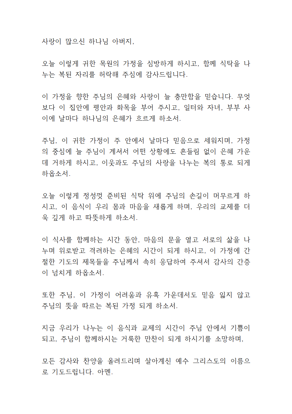 이 식사를 함께하는 시간 동안, 마음의 문을 열고 서로의 삶을 나누며 위로받고 격려하는 은혜의 시간이 되게 하시고, 이 가정에 간절한 기도의 제목들을 주님께서 속히 응답하여 주셔서 감사의 간증이 넘치게 하옵소서.