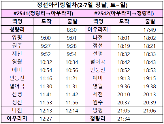 | #2541(청량리→아우라지) | #2542(아우라지→청량리) | ||||