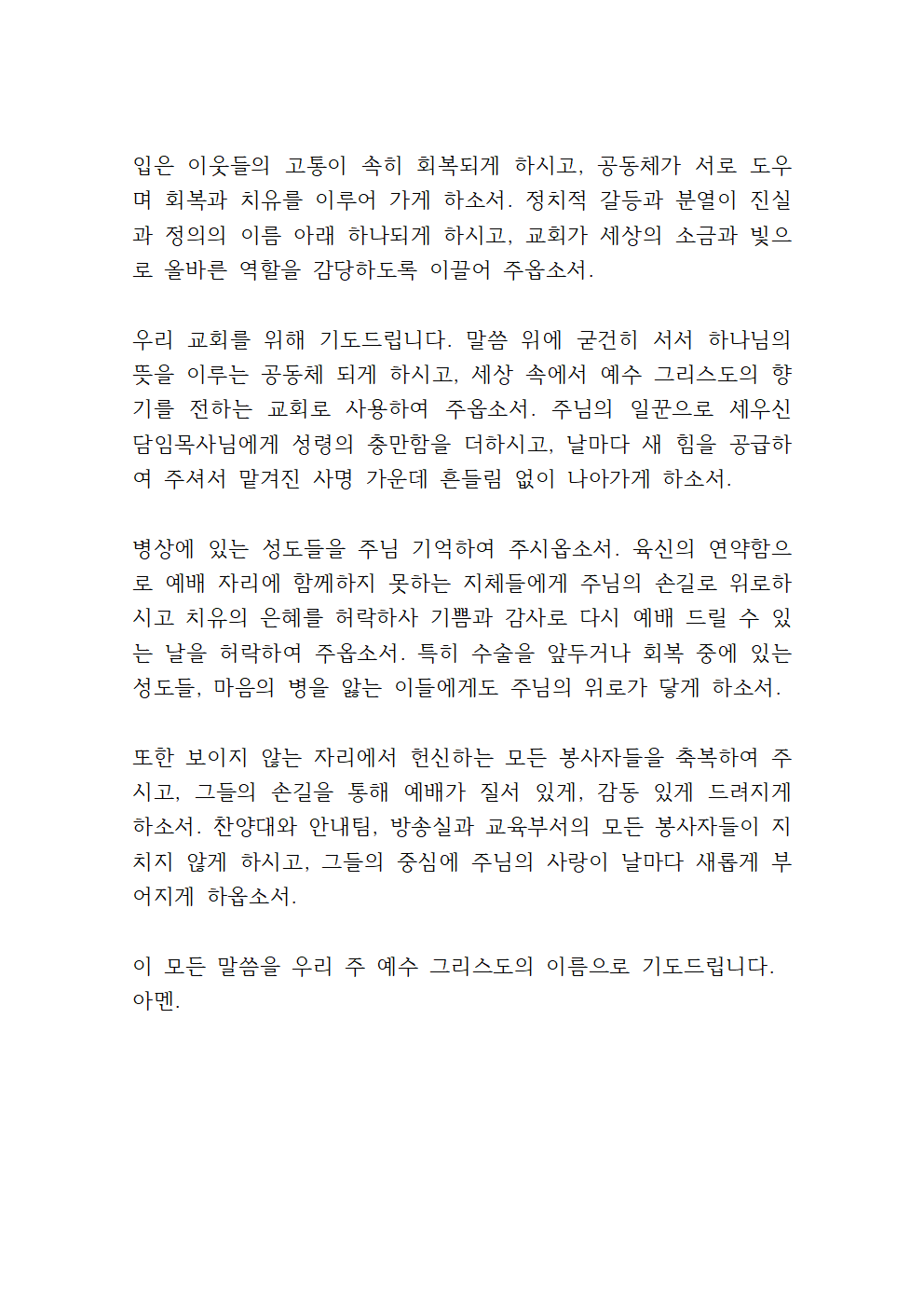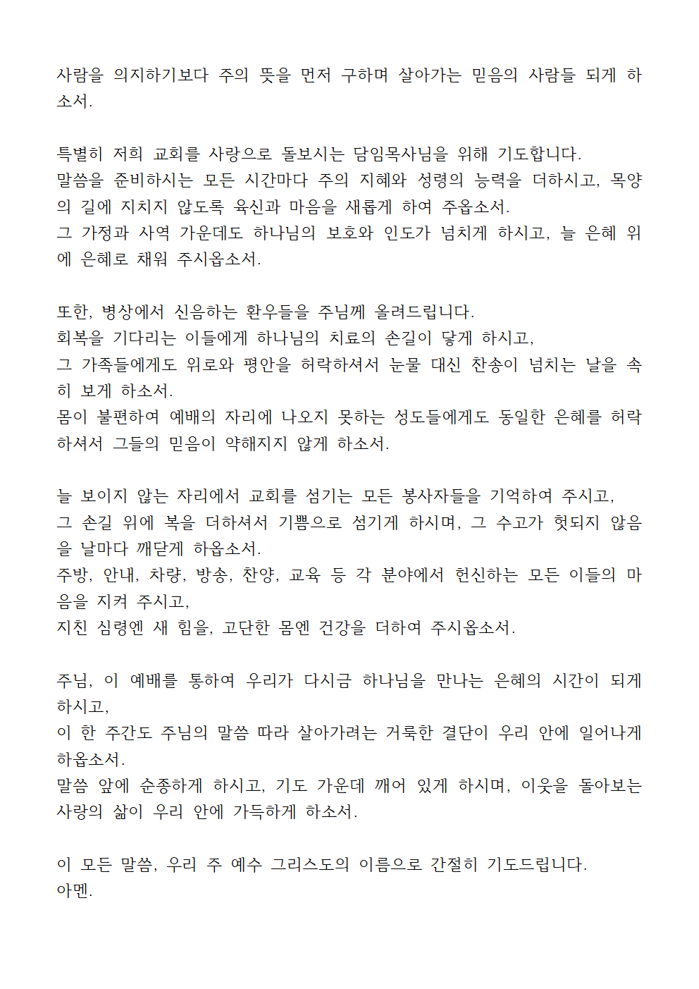 교회의 머리 되시는 주님, 우리 교회가 세상의 소금과 빛이 되기를 원합니다. 이 지역사회를 향한 복음의 창문이 되게 하시고, 이웃의 필요에 민감한 공동체가 되게 하시며, 단지 말씀을 듣는 데서 머무는 것이 아니라 말씀을 살아내는 교회가 되게 하옵소서. 외적인 성장보다 내적인 성숙이 앞서는 건강한 교회로 자라나게 하소서.
