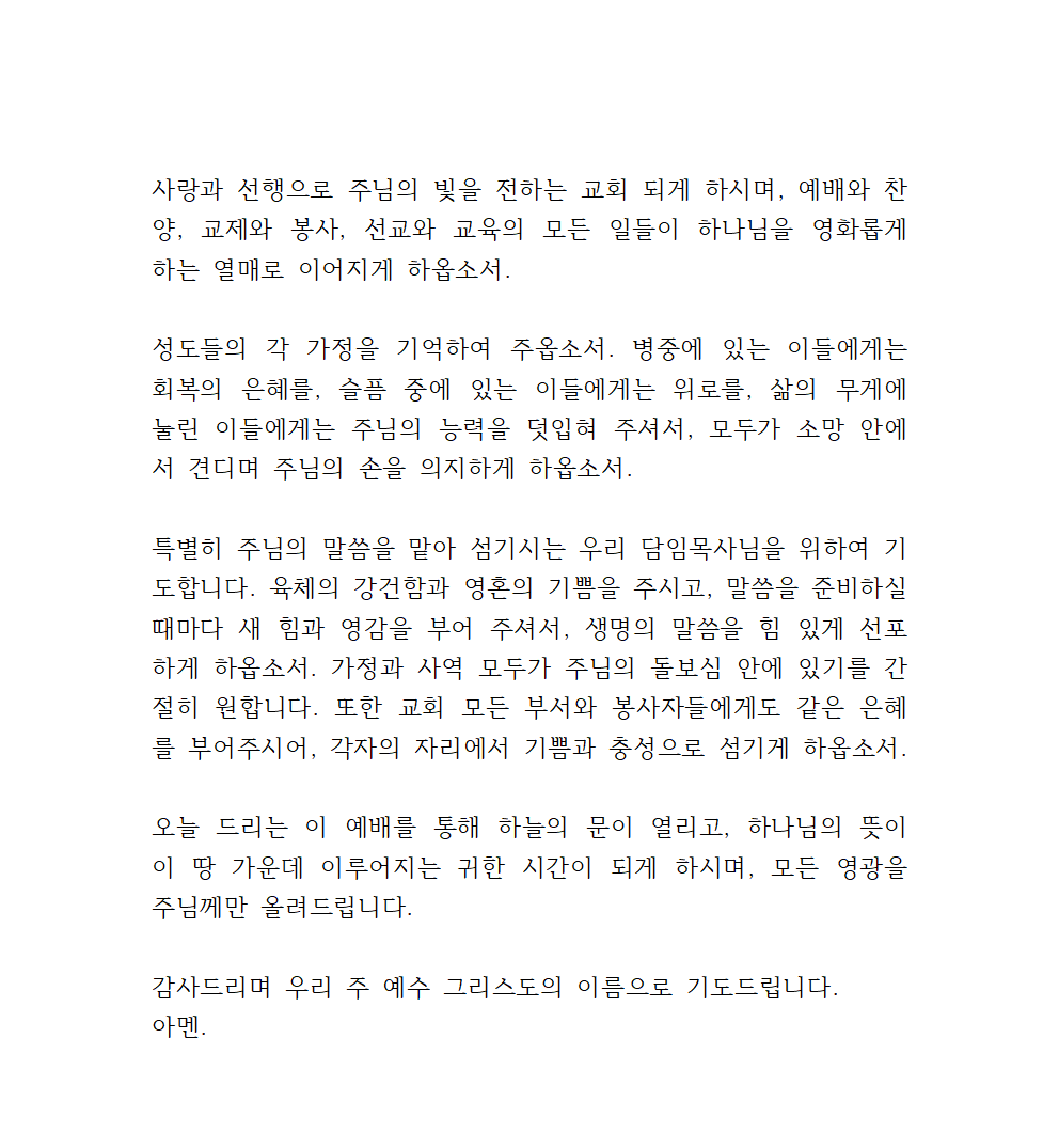 특별히 주님의 말씀을 맡아 섬기시는 우리 담임목사님을 위하여 기도합니다. 육체의 강건함과 영혼의 기쁨을 주시고, 말씀을 준비하실 때마다 새 힘과 영감을 부어 주셔서, 생명의 말씀을 힘 있게 선포하게 하옵소서. 가정과 사역 모두가 주님의 돌보심 안에 있기를 간절히 원합니다. 또한 교회 모든 부서와 봉사자들에게도 같은 은혜를 부어주시어, 각자의 자리에서 기쁨과 충성으로 섬기게 하옵소서.