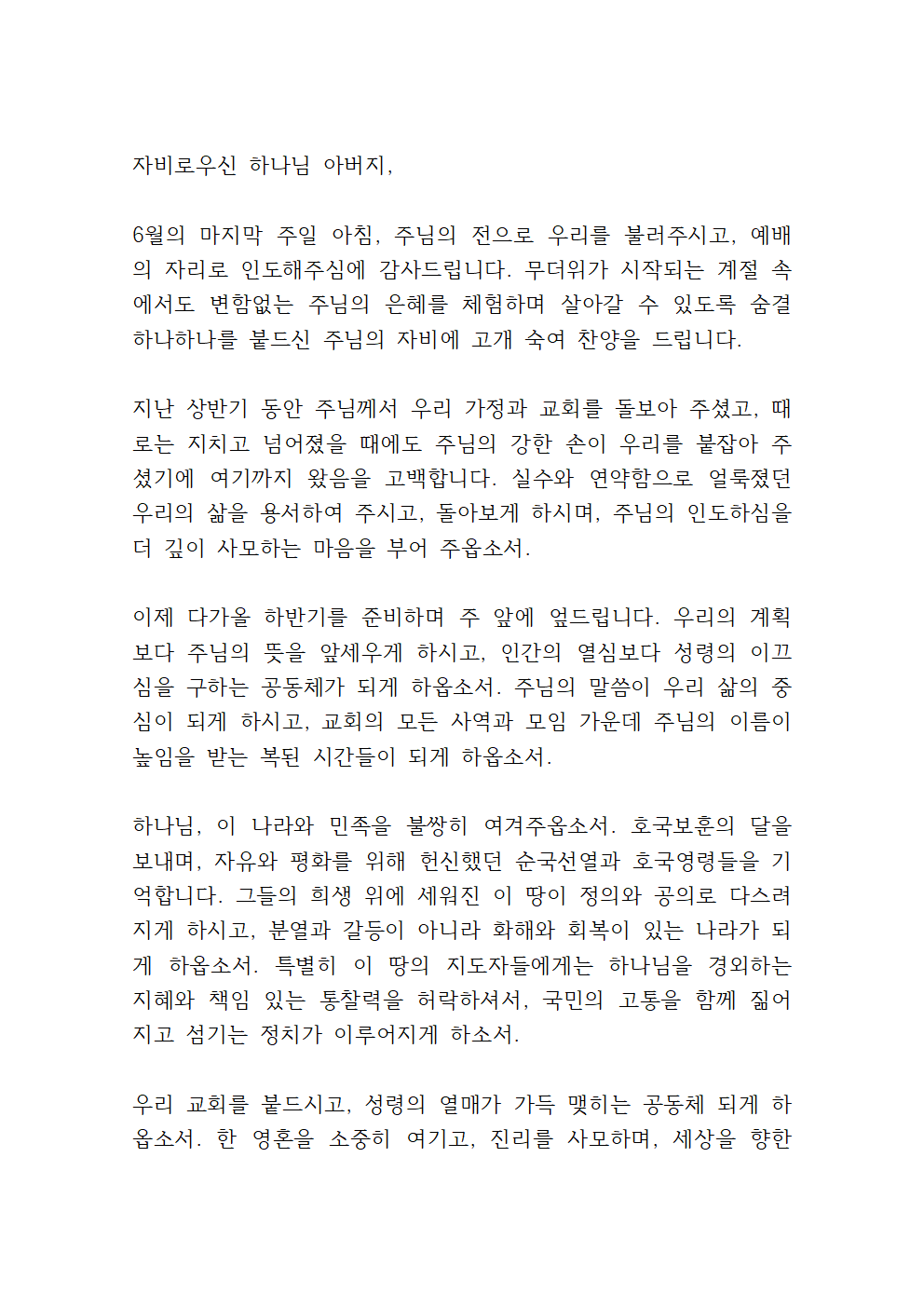 이번 6월 다섯째 주일 대표 기도에서는 6월 마지막 주일 예배를 맞아 상반기를 돌아보며 하나님의 은혜에 감사드리고, 다가올 하반기에도 주님의 인도하심을 기도하면 좋을 것 같습니다.