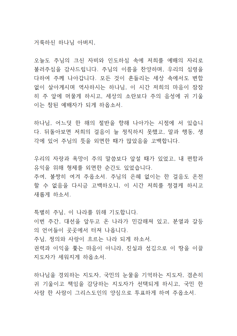 6월 다섯째 주일예배 대표기도문