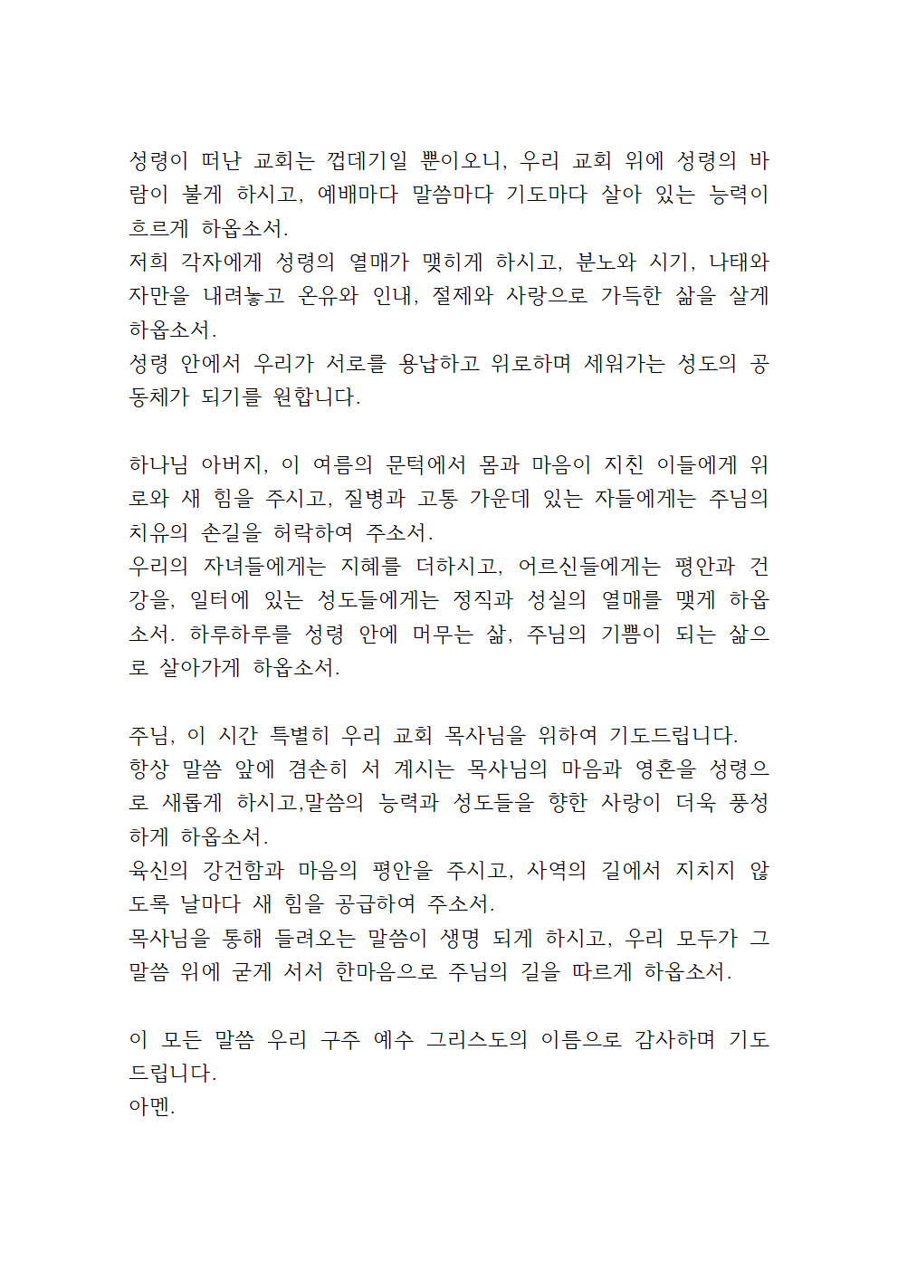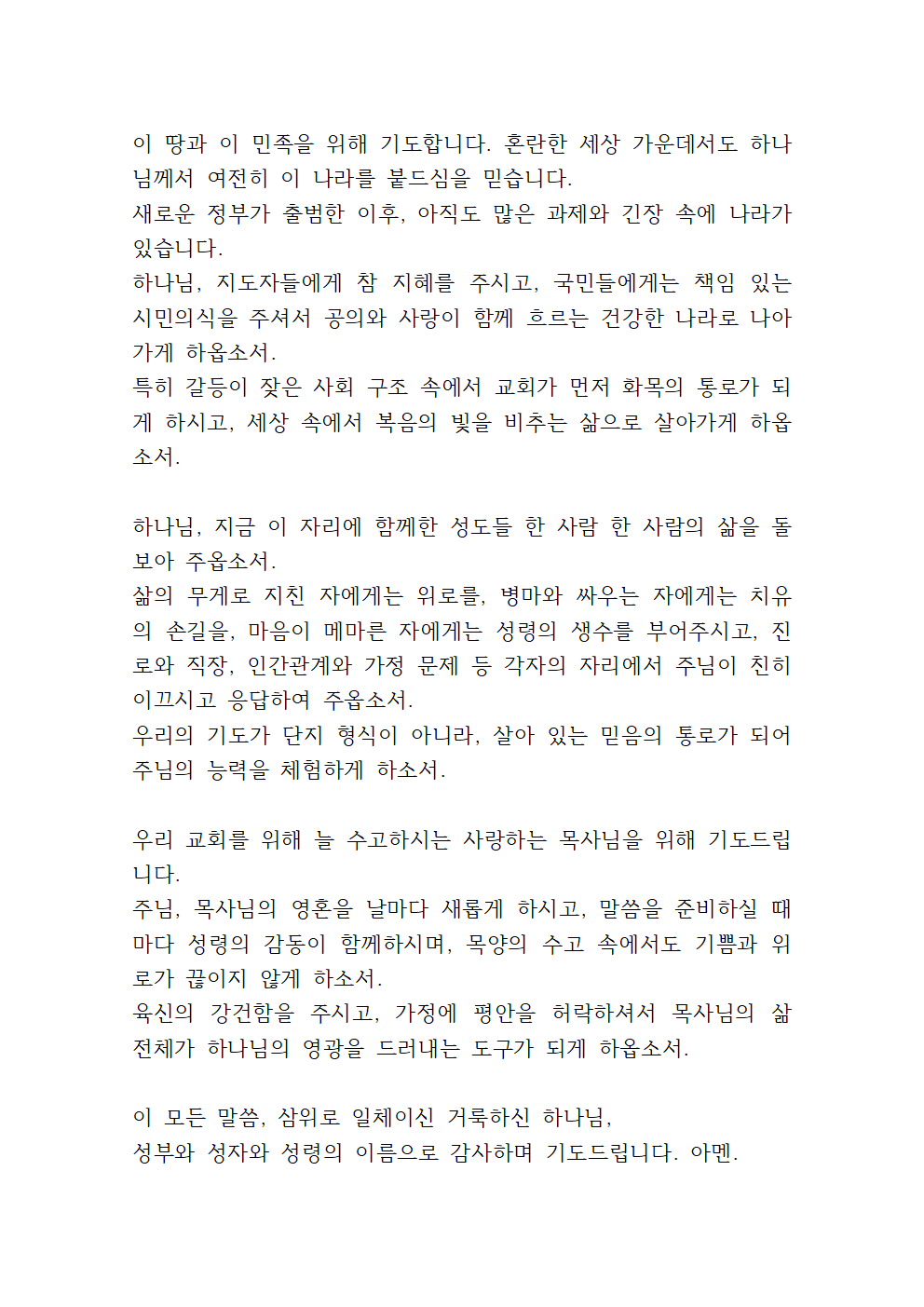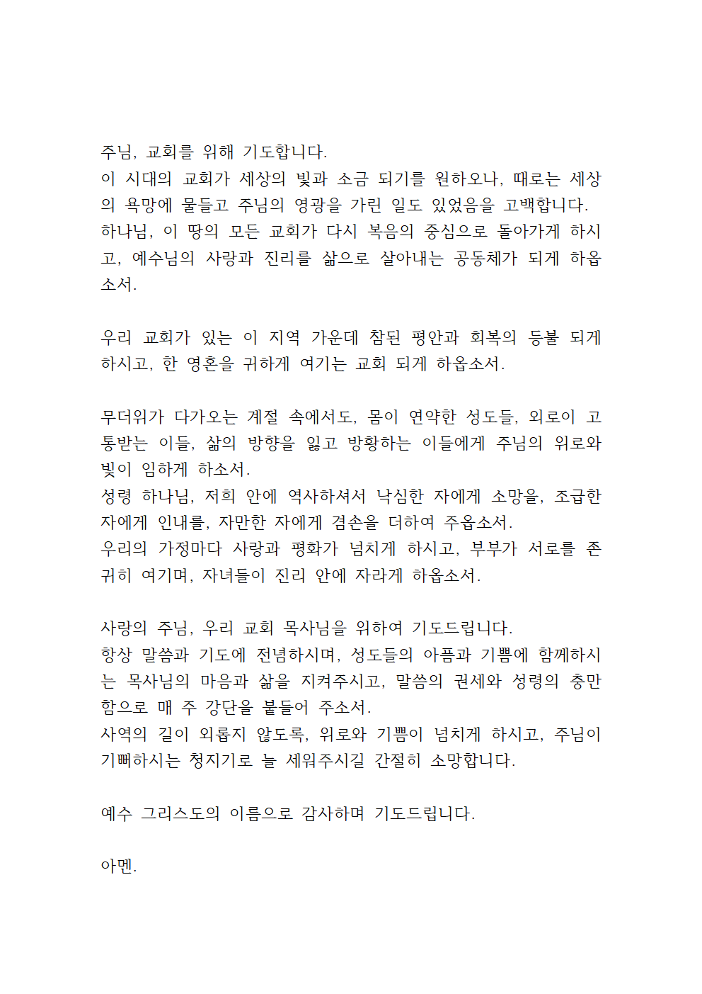 이 땅 위의 교회들이 세속화되지 않게 하시고, 복음의 본질을 붙들며, 이 땅을 살리고 민족을 치유하는 하나님의 도구로 쓰임 받게 하소서. 분열보다는 연합을, 비판보다는 중보를, 정죄보다는 사랑을 선택하는 성도들이 되게 하옵소서. 날마다 성령 안에서 새로워지는 믿음을 경험하게 하시고, 예배와 말씀과 기도의 능력을 다시금 회복하는 교회 되게 하소서.