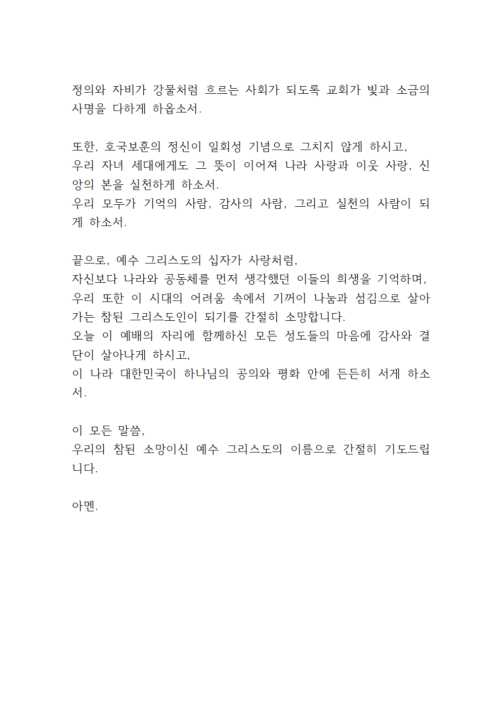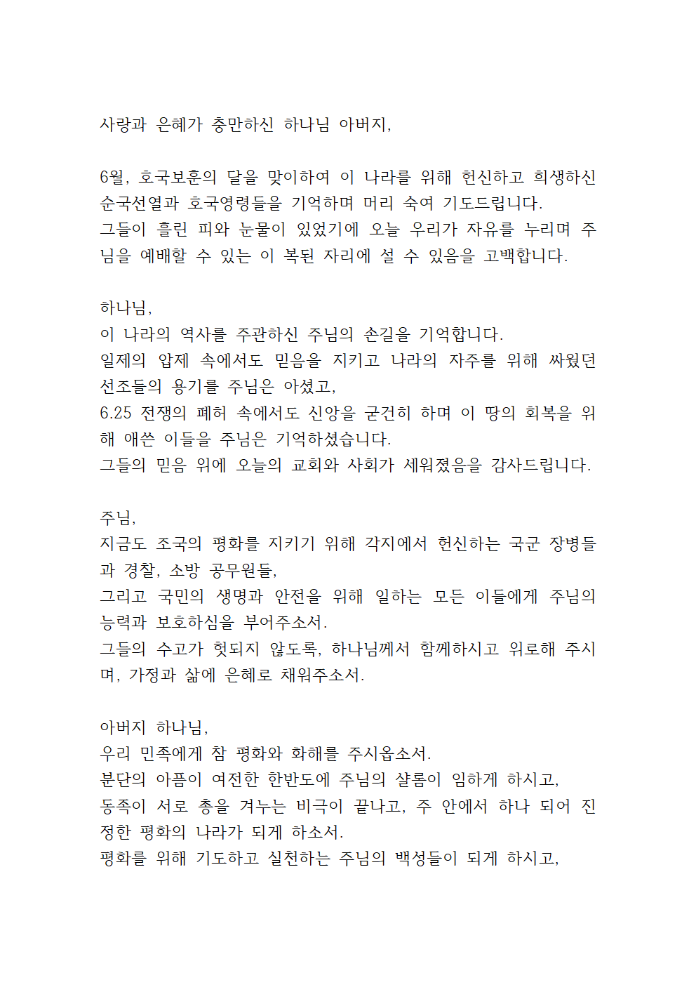 나라와 민족을 위한 기도문 (6월 호국 보훈의 달)