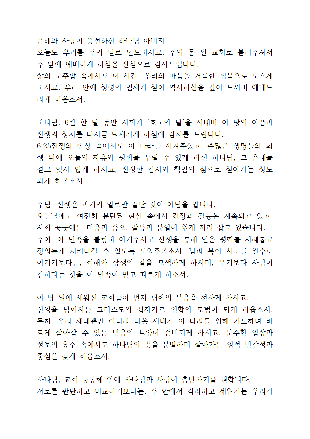 하나님, 지금 우리는 6월 ‘호국의 달’을 지나고 있습니다. 이 민족이 겪었던 6.25 전쟁의 아픔과 상처를 기억합니다. 수많은 생명들이 희생되었고, 피눈물로 얼룩졌던 그날들을 돌아보며 주님의 긍휼과 위로가 오늘 이 땅 위에도 새롭게 임하기를 간구합니다. 나라를 위해 목숨을 바쳤던 순국선열과 이름 없이 쓰러진 이들의 숭고한 희생을 결코 잊지 않게 하시고, 그분들의 헌신 위에 세워진 이 나라가 정의와 진리, 사랑의 터전 위에 더욱 굳건히 서게 하옵소서.