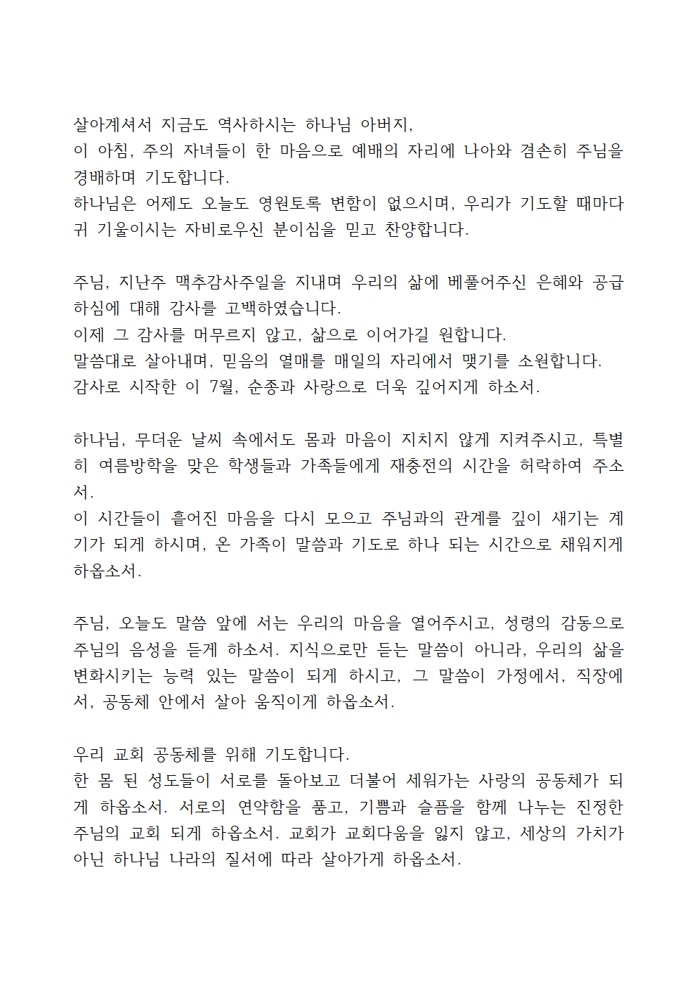 맥추감사절 이후, 주님의 은혜를 다시 삶의 자리로 이어가는 데 중점을 두고 기도하면 좋을 것 같습니다.
