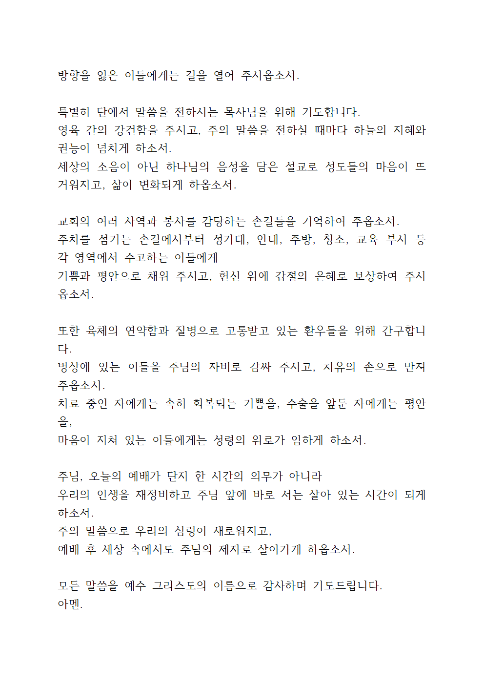 주님, 오늘의 예배가 단지 한 시간의 의무가 아니라 우리의 인생을 재정비하고 주님 앞에 바로 서는 살아 있는 시간이 되게 하소서. 주의 말씀으로 우리의 심령이 새로워지고, 예배 후 세상 속에서도 주님의 제자로 살아가게 하옵소서.